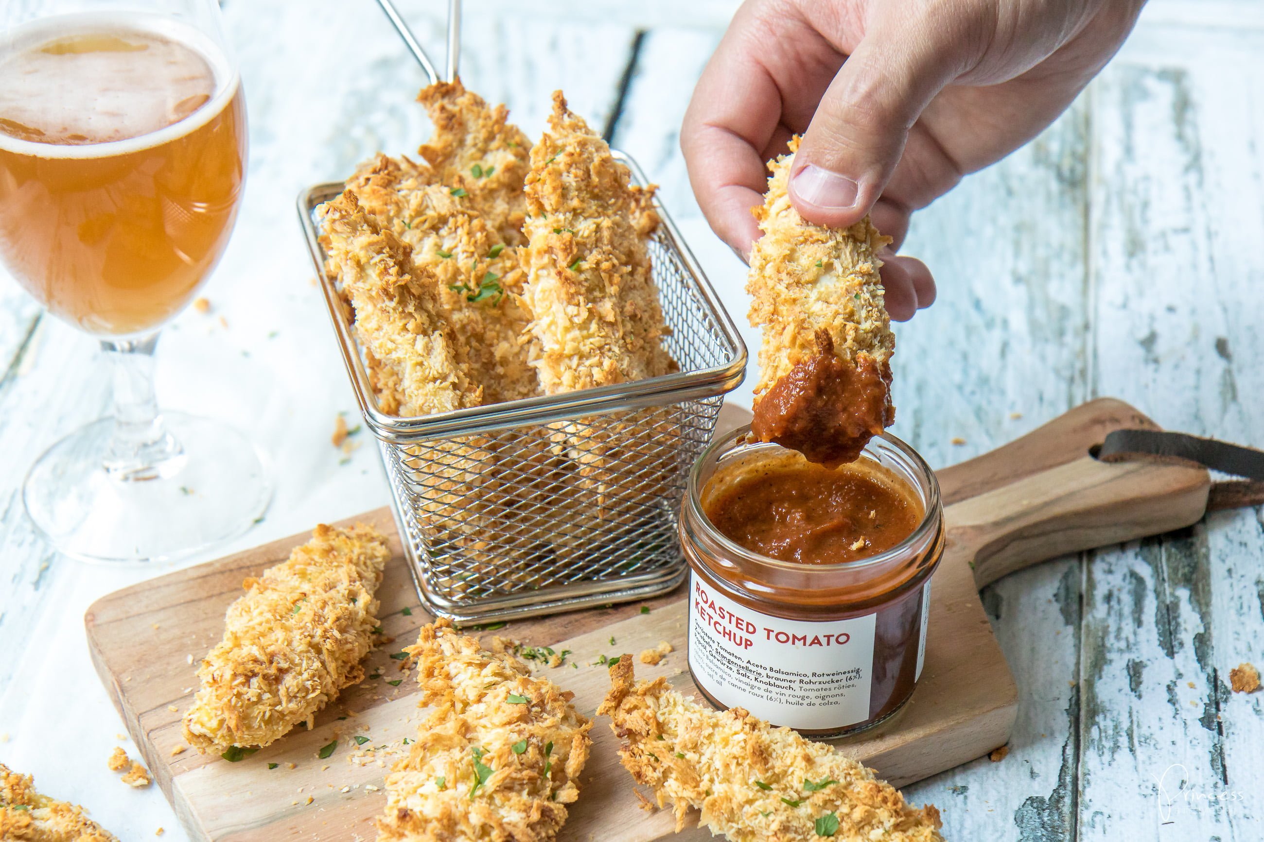 - Nach dem Backen die Crispy Chicken Fingers noch warm geniessen. Ich habe sie zusammen mit Gourmet Ketchup von Paul serviert. Die Varianten Beer-Onion-Pear und Roasted Tomatos passen hervorragend.