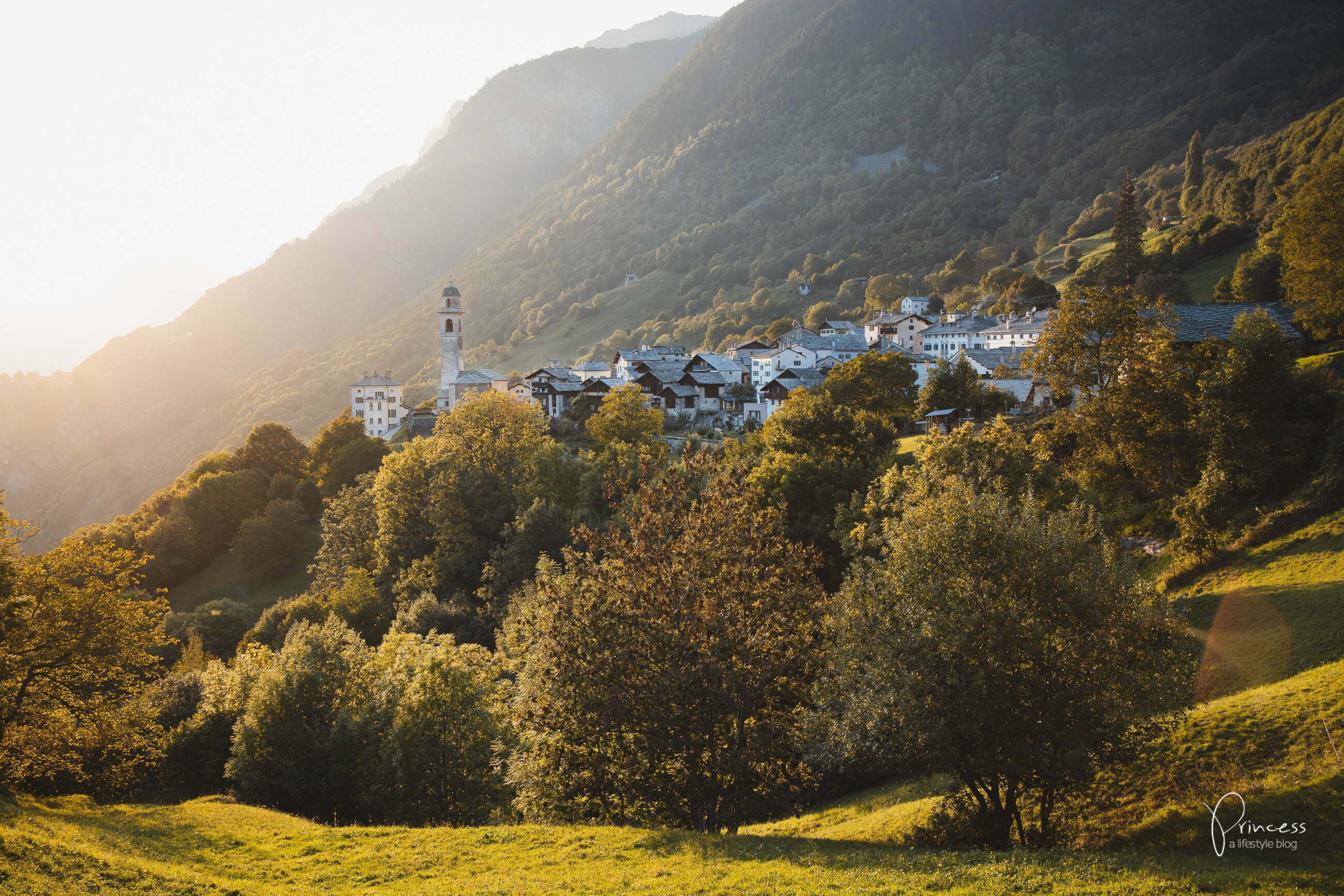 Das traumhafte Postkartenmotiv von Soglio findest du am östlichen Ortsausgang. Oder wenn du auf dem Panoramaweg auf Soglio zu wanderst. Vor dem Palazzo Salis biegt man rechts ab und läuft alles raus aus dem Dorf. In etwa hier findest du einige Bänke, die vor allem abends für den Sonnenuntergang die perfekte Sicht bieten.