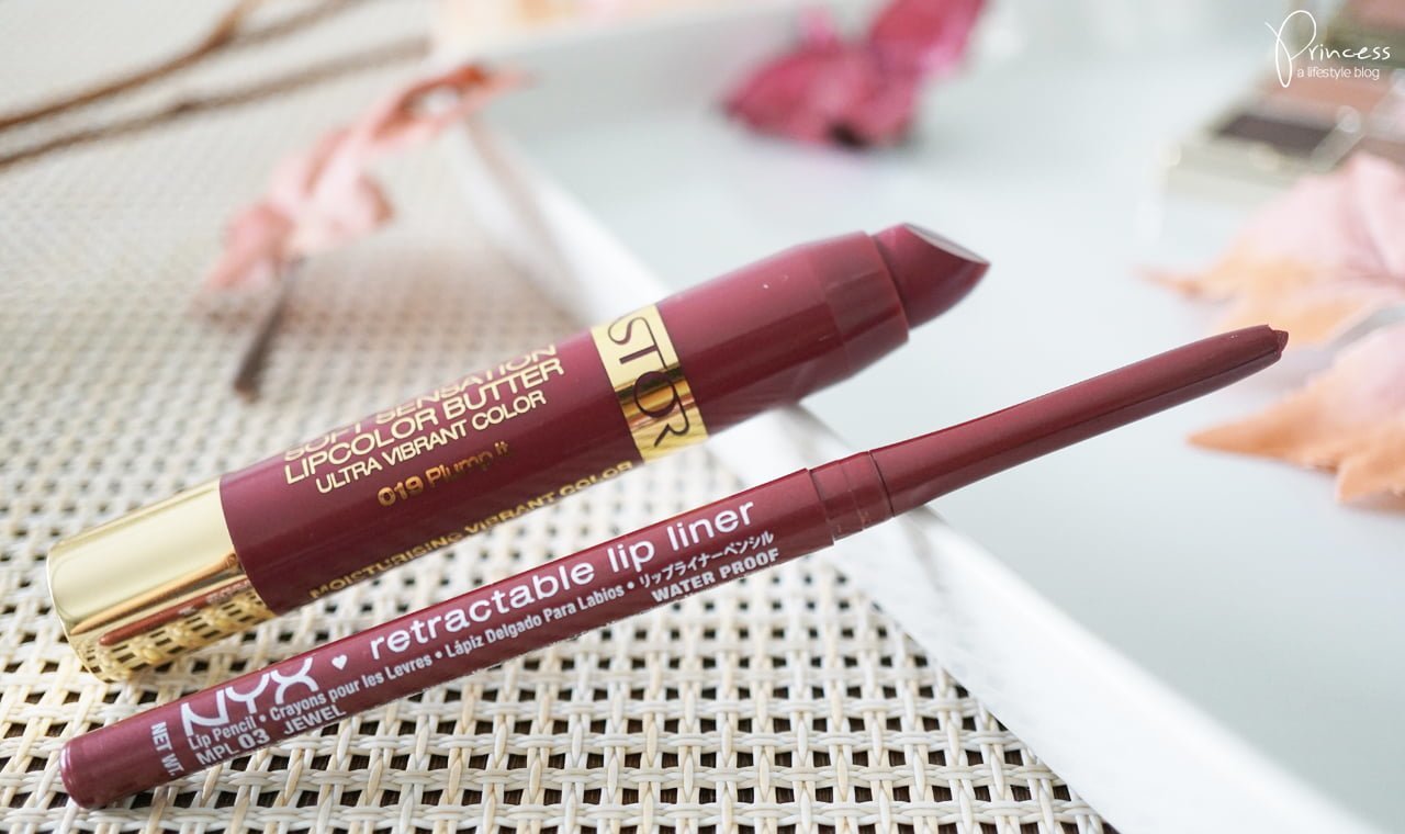Schon letztes Jahr hatte ich mir den Astor Soft Sensation Lipcolor Butter in diversen Farben gekauft. Da kam ein neues Exemplar vom „Plump it“ wie gerufen! Ein tolles Lippenprodukt, in Preis/Leistung nicht zu schlagen. Viele von euch kennen ihn schon. Die intensive Farbe und der Glanz eines Lippenstiftes, geschmeidig weich und pflegend wie ein Lippenbalm. Er hinterlässt keine doofen Ränder, trocknet die Lippen nicht aus und die Farbe sieht man auch Stunden später noch, auch wenn bereits etwas ausgebleicht. Dunkle Lippenstifte oder Glosse benutze ich mit Lipliner. Er sorgt dafür dass die Farbe nicht über den Lippenrand verläuft. Und wenn ich meine Lippen mit dem Stift schon als Basis leicht ausmale, hält die Farbe länger. Der Lipliner von NYX lässt sich rausdrehen, was ich den Linern zum Spitzen definitiv vorziehe.
