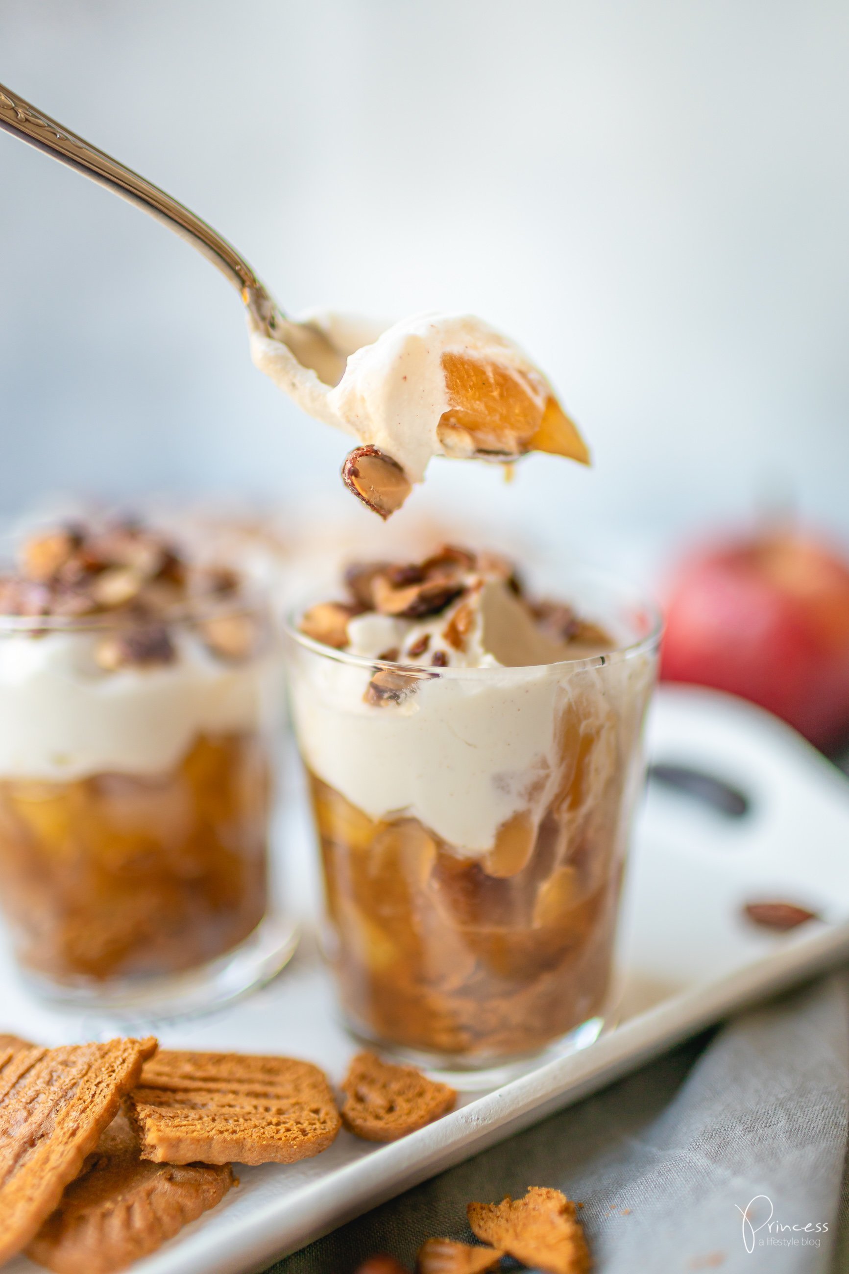 Du suchst ein weihnachtliches oder winterliches Dessert? Dann habe ich ein tolles Rezept für dich. Spekulatius Kekse geschichtet mit einer duftenden Bratapfel-Masse, dazu eine feine Creme aus Quark, Mascarpone und geschlagenem Rahm. Getoppt wird das ganze nur noch mit dem nötigen Crunch: gehackten und gebrannten Mandeln. Hört sich das nicht köstlich an? Na dann versuch es, ich bin sicher, du wirst es lieben!