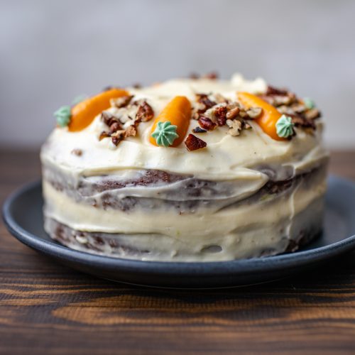 Untere Hälfte mit etwas Frosting bestreichen. Hälften zusammensetzen und den Kuchen mit Frosting einkleiden. Die restlichen Pekannüsse zur Dekoration auf den Kuchen geben.