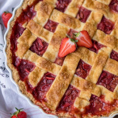 Nun folgt das Flechtmuster: Du kannst auch einfach Formen ausstechen und den Pie damit belegen. Ich habe dünne Streifen geschnitten und ein Flechtmuster gelegt. Dazu jeden zweiten Streifen vertikal auflegen. Jetzt jeden zweiten Streifen hochklappen und einen Steifen horizontal ergänzen, danach das ganze umgekehrt und wiederholen.