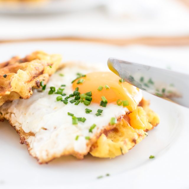 Daneben zwei Spiegeleier in etwas Bratbutter anbraten. Die Spiegeleier auf zwei Waffeln (oder drei bei absolut mächtigem Männer-Hunger) anrichten und mit Schnittlauch garnieren.