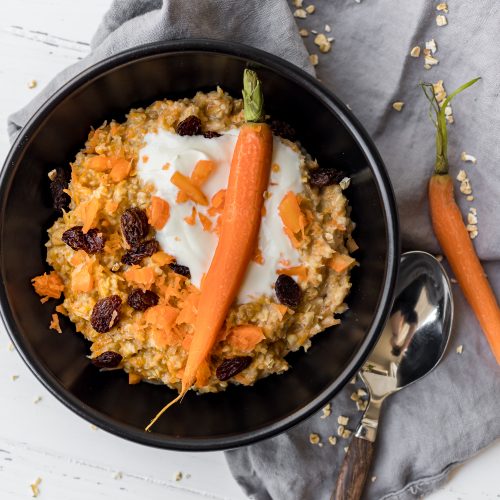Die Milch mit den Gewürzen in einer kleine Pfanne erwärmen und die Haferflocken und die geraffelten Rüebli einrühren. Die Mandeln dazu geben. Köcheln lassen auf niedriger Stufe unter ständigem Rühren bis die gewünschte Konsistenz erreicht ist. Bei feinen Haferflocken dauert es keine 5 Minuten.