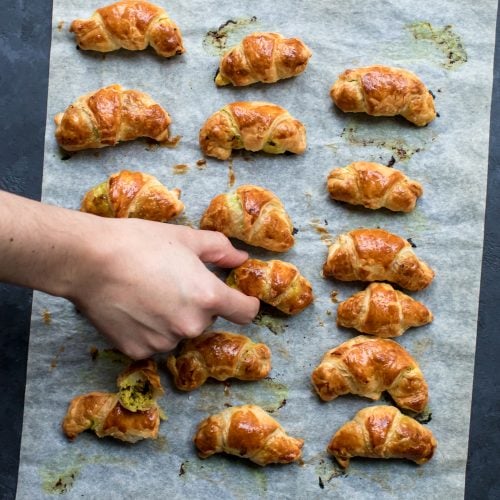 Die Gipfeli lassen sich auch vorbereiten und dann vor dem Backen (und bepinseln) einfrieren. Einfach zuerst mit etwas Abstand auf einem Teller anfrieren, sodass sie nachher nicht zusammen zusammenkleben. Die Gipfeli in einen Gefrierbeutel geben. So sind sie 2-3 Monate haltbar.
