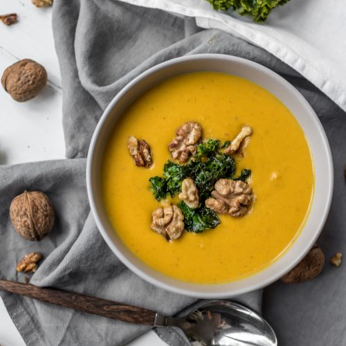 Baumnuss-Hälften in eine kleine Bratpfanne anbraten. Den Grünkühl waschen, trocken tupfen und vom Stiel trennen. In kleine Stücke schneiden. In wenig Olivenöl in der Bratpfanne knusprig anbraten. Zusammen mit den Nüssen die Suppe damit garnieren.