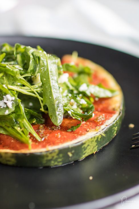 Die Wassermelone in „Steaks“ schneiden ca. 2 cm dick. Den Rub „einmassieren“.